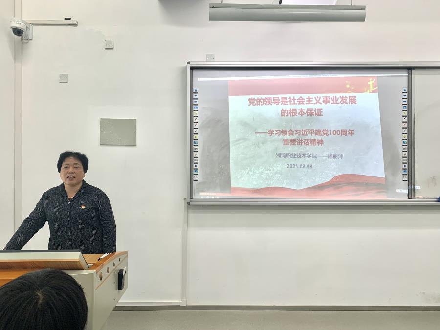 陈丽萍副院长从“办好中国的事情关键在党”、“党的领导是历史和人民的选择”、“中国共产党的成功密码”、“赓续伟大建党精神、践行初心使命”四个方面进行深入阐释,着重解读了“中国共产党的成功密码”和“赓续伟大建党精神、践行初心使命”这两点。她指出,中国共产党善于把理论与实践相结合,并结合许多故事案例,深刻分析了中国共产党成功的密码:一是坚持真理、坚守理想;二是践行初心、担当使命;三是不怕牺牲、英勇斗争;四是对党忠诚、不负人民。接着引用伟大领袖毛泽东为革命满门英烈及“弥天大勇”抵重庆谈判的事例,阐述了赓续伟大建党精神,践行初心使命的“三个必须”、“一个立足”,即必须坚持中国共产党的坚强领导、必须团结带领中国人民不断为美好生活而奋斗、必须刀刃向内,进行自我革命、立足岗位,勇于担当。