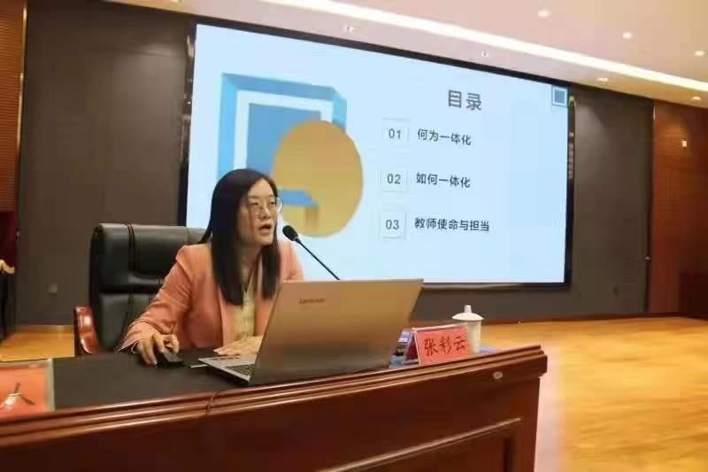 马克思主义学院张彩云老师作了题为《德育如何实现“大中小学一体化”》的讲座。张老师指出如何建构有大中小学特性的思政课,帮助学生解决成长中的困惑,满足他们思想道德成长的需要,依然是重要课题。张老师从“何为一体化”“如何一体化”“教师使命与担当”三个维度来阐释德育一体化的概念界定、政策依据、顶层内容体系,提出课程设计一体化、德育资源一体化、德育师资一体化、德育评价一体化等实现路径,剖析推进大中小学德育一体化的现实困境,提出六大方面的教师育德能力培育,并以鲜活的“爱国活动课程”、“疫情大考的中国答卷”两个主题活动德育课程的创建为例,指导不同学段班主任能够以不同的方式与各学段学生自身经验和认识发生连接,使班主任德育理论水平上了一个新台阶。