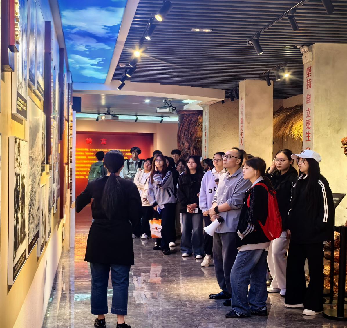 在东圳事迹教育基地讲解员的引导下,师生们走进东圳精神厅,共同观看建库纪录片《与人民干在一起》,重温那段热火朝天的奋斗岁月。展厅内仿建的草房工棚中,陈列着当年民工使用的锄头、铁锹、燃油灯、手电筒等劳动工具与生活用品。墙上一幅幅真实的历史图像,生动再现了建设者们肩挑背扛、攻坚克难的动人场景。每一件实物、每一张图片,都无声讲述着那段峥嵘岁月,深刻诠释了“团结协作、艰苦奋斗、无私奉献”的东圳精神。