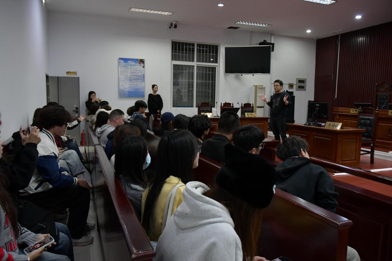 随后师生们有序走进审判庭进行参观。从安检区域的规范流程,到审判庭内法槌、法袍的庄重陈列,再到诉讼服务窗口的便民设施,大家在工作人员指引下,逐一了解法庭各功能区域的设置与作用,直观感受司法工作的严谨性与规范性。