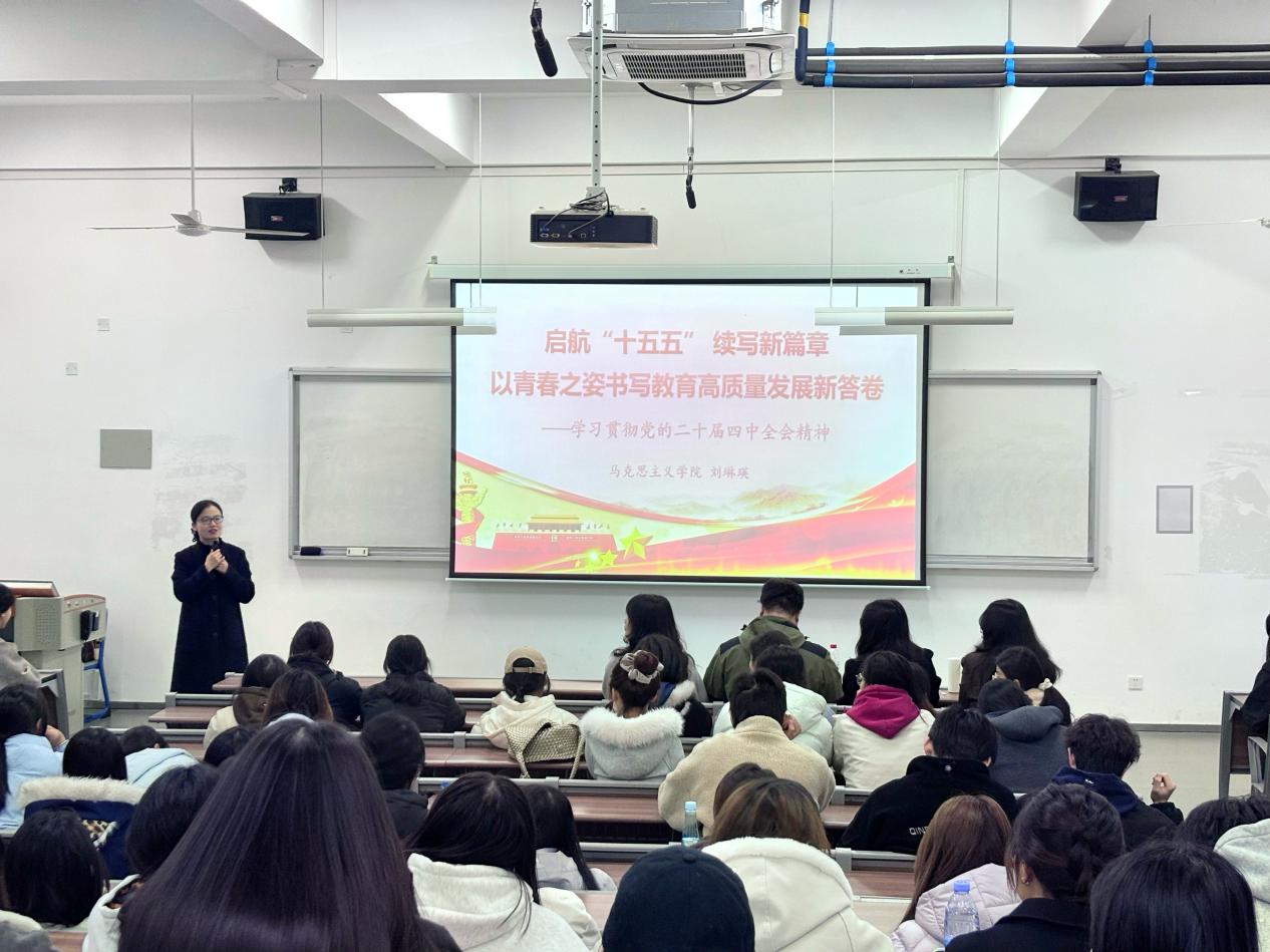 为深入学习贯彻党的二十届四中全会精神,引导学生准确把握一体推进教育科技人才发展的重要部署,1月6日下午,学前教育系邀请马克思主义学院刘琳瑛老师开展题为《启航“十五五”续写新篇章以青春之姿书写教育高质量发展新答卷》的专题宣讲。学前教育系各年级学生代表、入党积极分子、预备党员参加学习。